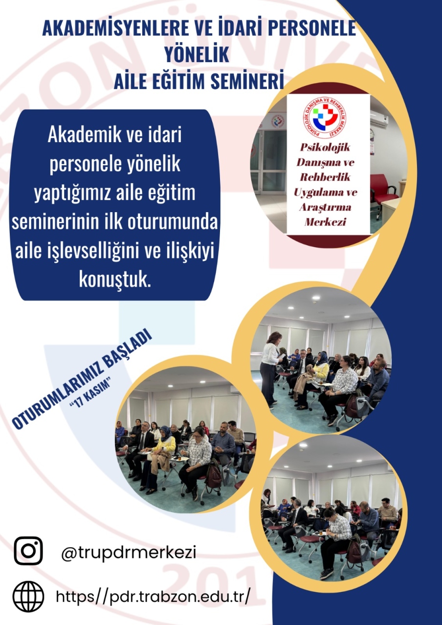 Trabzon Üniversitesi Psikolojik Danışma ve Rehberlik Uygulama ve Araştırma Merkezinde akademisyen ve idari personele yönelik olarak düzenlenen dört oturumluk "Aile Eğitim Seminerleri" 17 Kasım Pazartesi başladı.